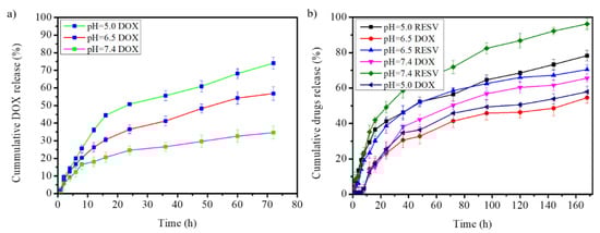 Cumulative drug release from (a) G4.5-DOX (DOX encapsulated in the G4.5 PAMAM dendrimer) and (b) Na-DOC-hyd-RESV+G4.5-DOX (G4.5-DOX entrapped in RESV-loaded Na-DOC-hydrogel) at pH 5.0, 6.5, and 7.4.