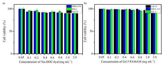 Testing the biocompatibility of biomaterials in drug delivery systems is important prior to their application in animal models for assessing the efficacy of drug delivery. In agreement with this reasoning, the cytotoxicity of the empty G4.5 PAMAM dendrimer and Na-DOC-hydrogel were determined using the MTT cytotoxicity assay on three different cell lines. Cell viability was assessed based on optical absorbance at 570 nm using an ELISA plate reader. As shown in Figure 8a, the percentage of viable HeLa, MDA-MB-231, and HaCaT cells after incubation with maximum 2.0 mg mL−1 Na-DOC-hydrogel for 24 h were 91.23 ± 1.80, 90.06 ± 1.41%, and 89.96 ± 2.80%, respectively. The results of the biocompatibility study after co-incubation with maximum 2 mg mL−1 G4.5 PAMAM dendrimer revealed that the polymer was more biosafe than the Na-DOC hydrogel, as 98.23 ± 1.06, 96.68 ± 1.75, and 99.26 ± 2.06% viable cells were observed for HeLa, MDA-MB-231, and HaCaT, respectively (Figure 8b). These cytotoxicity studies confirmed that both the G4.5 PAMAM dendrimer and the hydrogel showed negligible toxicity towards different cells lines even at their highest doses. Thus, the biocompatibility studies of both the Na-DOC-hydrogel and G4.5 PAMAM dendrimer confirmed that the current drug delivery system conforms with the background information from the literature [,] and the results of former studies [,,] and that it can be used safely in animal models as anticancer co-drug delivery system for DOX and RESV.