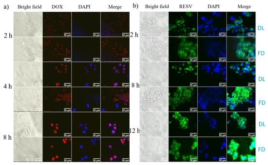 Fluorescence microscope images of HeLa cells incubated with (a) G4.5-DOX and (b) Na-DOC-hyd-RESV (in all treatment 2.5 µg mL−1 and 7.5 µg mL−1 equivalent concentration of DOX and RESV, respectively, were used), [DL = drug loaded materials treated cells (Na-DOC-hyd-RESV or G4.5-DOX) and FD = free drugs (RESV or DOX).
