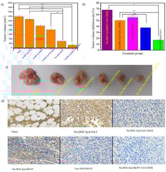 In addition to testing the antitumor activity, the anti-angiogenic effects of the co-delivered DOX and RESV in the formulation were also investigated. Toward this, the samples collected from the tumor tissues (Figure 10c) of each group were stained using CD31 antibody for assessing micro-vessel density (MVD) and blood vessel size (diameter). As shown in Figure 10d, the tumor tissue collected from mice treated with Na-DOC-hyd-RESV+G4.5-DOX and free mixed DOX+RESV showed noticeable reduction in the density and diameter of the blood vessel (stained brown) compared to those mice treated with saline and Na-DOC-hyd+G4.5. This indicated that the presence of RESV along with DOX enhanced suppression of blood vessel formation and inhibited the growth of the already formed blood vessels, thereby reducing tumor volume. In contrast, the results obtained with single drug-loaded formulations, Na-DOC-hyd-RESV and Na-DOC-hyd+G4.5-DOX, were almost similar. Among the four drug based treatment groups, the reduction in MVD and size of the blood vessels in the Na-DOC-RESV+G4.5-DOX formulation-treated group were significant, which might be due to the synergistic [] anti-angiogenic effect [,,] of RESV.
