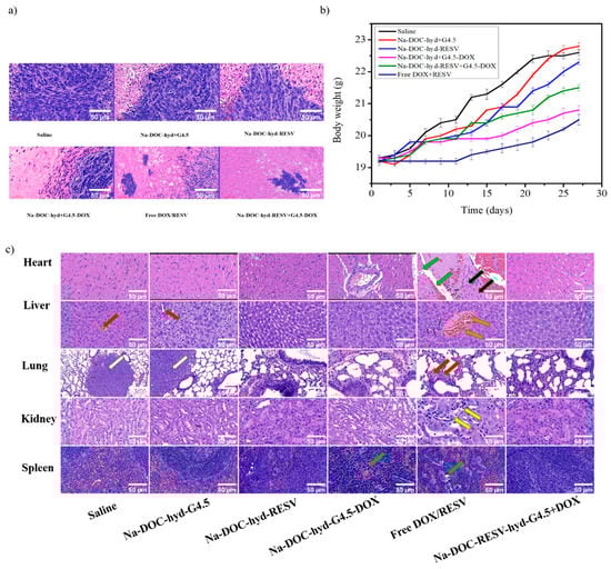 As shown in Figure 11b, significant changes in body weight were observed in the free DOX/RESV and saline (control)-treated groups. The free DOX/RESV-treated group displayed the lowest body weight changes at the end of the treatment period. However, the differences in body weight of Na-DOC-hyd+G4.5 and Na-DOC-hyd-RESV-treated tumor-bearing groups were negligible compared to that of the control. This indicated that Na-DOC-hyd+G4.5 and RESV did not exert any pronounced acute or chronic toxic effects on mice body. The lowest body weight change in the free DOX/RESV-treated tumor-bearing group may be due to the toxicity of the high concentration and the free diffusion of DOX into the cells, which was cytotoxic.