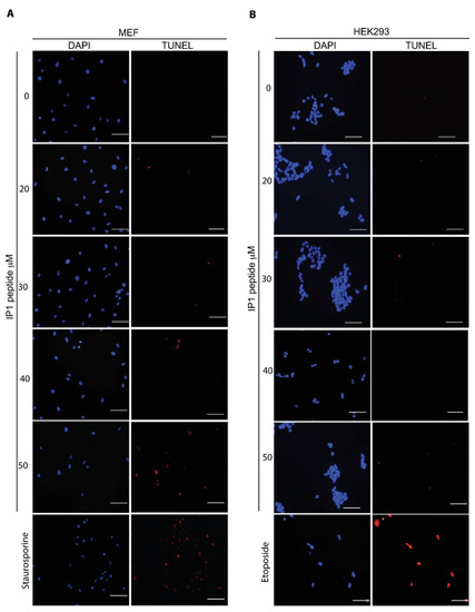 IP-1 induces DNA fragmentation in mammalian cells. Mouse Embryonic Fibroblasts (MEFs) (A) or HEK293T cells (B) were incubated for 6 h with the indicated concentrations of IP-1 peptide. As positive controls, MEFS were treated with 2 μM Staurosporine (A) and HEK293T cells were treated with 400 μM etoposide for 2 h. Notice an increasing number of TUNEL-positive cells, which indicates DNA fragmentation, in cells treated with increasing concentrations of IP-1; the experiments were conducted once and were validated with annexin V staining (see below). Nuclei were labeled with DAPI. Scale bar represents 100 μm.