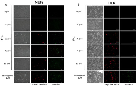 IP-1 induces apoptosis at low doses in MEF cells and necrosis at higher doses in HEK293T cells. MEF (A) and HEK293T (B) cells were treated with IP-1 at the indicated concentrations or with 2 μM Staurosporine for 2 h as positive control. Then, the cells were stained with Annexin V-FITC in order to detect PS exposed to the outer layer of the cell membrane, an event related to apoptosis induction. Additionally, cells that have lost membrane integrity also incorporate propidium iodide, showing red fluorescent staining. As shown in (A), starting at 30 μM of IP-1, MEF cells present Annexin V or propidium iodide staining, unlike to HEK293T cells that only incorporated propidium iodide. Experiments were conducted twice; the images are representative. Scale bar represents 100 μM.