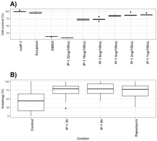 Cytotoxicity and autophagy induction of IP-1 on macrophages. Top panel: (A) Percentage of macrophages (J774.1) staining with violet dye, as an indicator of cell survival (see Materials and Methods section). noIP-1 and Excipient shows percentage of staining on cells without IP-1; DMSO is a toxic agent to macrophages and serves as positive control for dead cells; different concentrations of IP-1 were used (1, 2, 4, 8, 16, and 32 μM) to test for the survival of macrophages. The data were derived from at least 3 to 6 independent experiments. Bottom panel: (B) The percentage of cells showing green dots as indicative of autophagy as detected by Cyto-ID (see Materials and Methods section). Control are cells not exposed to IP-1, Rapamycin show the results of cells exposed to the autophagy-inducer rapamycin, and the autophagy detected at 3 and 6 h in the presence of IP-1 are shown. These data were derived from at least 30 photographs obtained from 3 independent experiments. The statistical comparison between groups was performed using ANOVA test and the p-values were obtained from a Post-hoc analysis with Tukey test (see [34]). The black circles represent outliers.