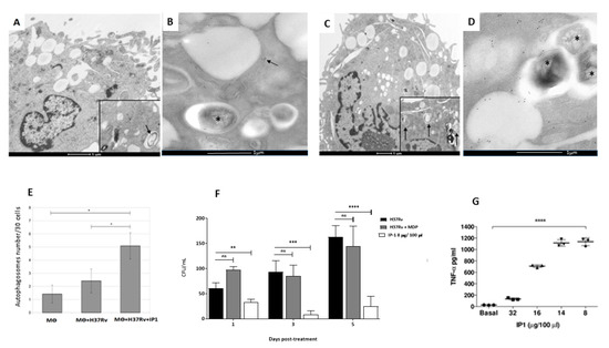 Effect of IP-1 on macrophages infected in-vitro with M. tuberculosis strain H37Rv. Representative electron microscopy micrographs of: (A) macrophage after one hour infection showing a phagocytosed bacteria and in the inset occasional double membrane vacuoles that correspond to autophagosomes (arrow). (B) Subcellular detection of autophagosomes by immunolabeling with specific antibodies against LC3, macrophage after 24 h of infection showing a phagosome with bacteria (asterisk) near to vacuoles/lysosomes surrounded by LC-3 detected by gold labeled antibodies (black dots, arrow). (C) Infected macrophage and incubated with IP-1 showing bacterial debris and in the inset several autophagosomes (arrows). (D) Infected macrophage incubated with LC-3 showing bacteria into phagosomes (asterisks) near to several LC-3 immunogold labeled vacuoles/lysosomes (black dots). (E) The morphometric study confirms significantly more autophagosomes (y-axis) in infected macrophages incubated with IP-1. (F) Determination of intracellular bacillary loads by colony forming units counts (CFU) in infected macrophages with mycobacteria strain H37Rv, after one, three and five days of incubation with MDP (muramil dipeptide control) or with 16 µg/100 µL of IP-1; all the studied times showed significant decrease of live bacillary counts. (G) Macrophages were infected with mycobacteria strain H37Rv, and after 24 h of incubation with the indicated concentration of IP-1 the supernatants were collected and used to determine TNFα by ELISA, low IP-1 concentrations (8 and 16 μg/100 μL) induced significant amount of TNFα, while larger IP-1 concentration (32 μg/100 μL) reduced its production. Each symbol represents one independent experiment. Each symbol (Triangles, squares, circles) represents one independent experiment. Asterisk represents statistical significance (* p < 0.05, ** p < 0.003, *** p < 0.002, **** p < 0.0005). ns: not significant.