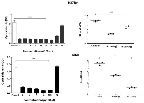 Effect of IP-1 against M. tuberculosis (top panel H37Rv, bottom panel MDR strain) in vitro. Left figures show the MICs determined by broth microdilution evaluated by a colorimetric assay using Cell Titer 96® Aqueous, and right figures show viability of the bacteria by counting the colony-forming units after treatment with the indicated IP-1 concentrations; each symbol (Triangles, squares, circles) represent an independent determination. All the IP-1 concentrations showed significant activity against mycobacteria, being MDR strain more susceptible to IP-1 and similar to the MIC control that corresponded to amikacin (AMK), an antibiotic for which this strain is highly susceptible, and for drug-sensible H37Rv strain isoniazid (INH) that is the most efficient primary antibiotic. As negative control we include P2, a synthetic peptide derived from arachnid AMP at 64 μg. Each result is reported as the mean ± SD, asterisk represents statistical significance (** p < 0.003, **** p < 0.0005).