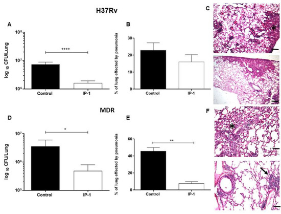 Effect of IP-1 treatment in BALB/c mice at 60 days post-infection with the drug-sensitive or drug resistant MTB strains. (A) Groups of mice infected with drug sensitive H37Rv strain were treated with 8 µg of IP-1 by intratracheal route each other day during one month, right lung was used to determinate bacillary loads by colony forming units (CFU), treated mice showed a significant decrease of live bacilli in comparison with control mice. (B) Left lungs were perfused with formaldehyde and used to determine pneumonia by automated morphometry, in comparison with control mice, a non-significant decrease of lung consolidation was seen in treated animals. (C) Representative micrographs of control non-treated mouse infected with H37Rv strain (top figure) shows similar lung surface area affected by pneumonia (asterisk) that in mouse treated with IP-1 (bottom figure). (D) The same treatment in mice infected with MDR strain showed a significant decrease of bacillary loads and lung surface affected by pneumonia. (E) Asterisk represents statistical significance (p < 0.05). (F) Representative micrograph of control non-treated mouse infected with MDR strain showing areas of pneumonia (asterisk, top figure), in comparison with MDR infected mouse treated with IP-1 that exhibits small patches of pneumonia (arrow, bottom figure) and perivascular inflammation (H/E staining, magnification 100×). The images correspond with one representative experiment. The bars in images (C) and (F) represent 200 μm. Asterisk represents statistical significance (* p < 0.05, ** p < 0.003, **** p < 0.0005).