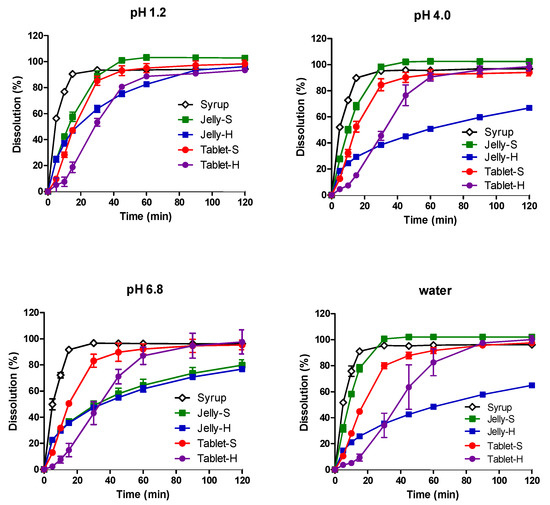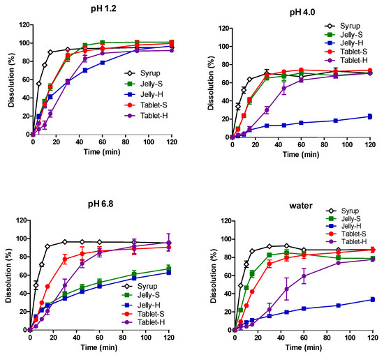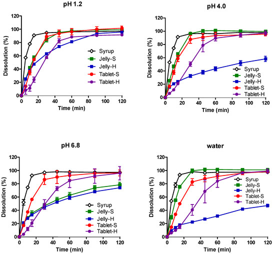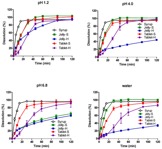 Jelly-S and Jelly-H formulations contained carrageenan, which is known to be hydrolyzed in acidic pH [32,33]. Hence, the increased dissolution of the drugs from Jelly-S and Jelly-H in acidic pH was likely due to acidic hydrolysis of carrageenan. However, the increased dissolution by acidic pH was alleviated by the addition of Xanthan gum into the formulation, as shown in Xanthan gum-containing Jelly-H compared to the non-Xanthan gum formulation, Jelly-S. For Jelly-S, the dissolutions of the drugs were increased by decreasing pH in order of pH 1.2 > pH 4.0 > pH 6.8. On the contrary, Jelly-H showed increased dissolution in pH 1.2, while similar low dissolution rate between pH 4.0 and 6.8. The different behavior between Jelly-S and Jelly-H was likely due to the enhanced gel strength by xanthan gum. In purified water, Jelly-S showed a higher dissolution rate compared to Jelly-H. Similarly, Tablet-S exhibited higher dissolution in water than Tablet-H did. The dissolution pattern in the salt-free condition appeared to offer information on the effect of gel strength of the jellies or tablet strength on the hydration rate, which can subsequently affect dissolution rate. As expected, higher gel strength and tablet hardness caused lower dissolution rates regardless of the types of drugs, as shown in Figure 1, Figure 2, Figure 3 and Figure 4.