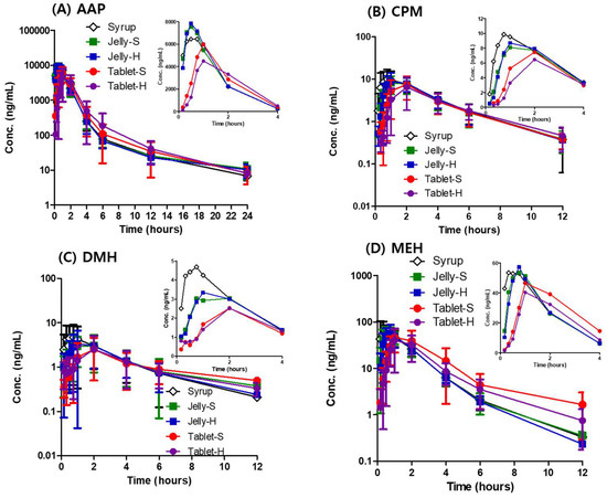 The plasma concentration profiles of AAP, CPM, DMH, and MEH are presented in Figure 5. As shown in the initial plasma concentration profile for 4 h, the jellies and syrup showed rapid absorption of AAP, while both tablets retarded the absorption of AAP exhibiting lower Cmax and delayed Tmax (Table 4). As mentioned in the dissolution study, the delayed dissolution of AAP from the Jelly-H in pH 4.0, 6.8, and water did not affect in vivo absorption because most AAP was dissolved in the stomach to be absorbed in the small intestine. Similarly, Tablet-H delayed the absorption of the other three drugs as well. Tablet-H reduced the mean Cmax of CPM by approximately 30% compared to the syrup (6.9 ± 4.3 vs. 11.3 ± 6.3) even though the difference was not statistically significant. On the contrary, Jelly-S and Jelly-H showed comparable Cmax and Tmax of CPM to the syrup as shown in Table 3. Compared to the syrup, the absorption of DMH was delayed more by the jellies and tablets. Jelly-S and Jelly-H reduced Cmax of DMH by approximately 30% compared to the syrup, while Tablet-S and Tablet-S decreased the Cmax by more than 50%. For MEH, a similar pattern was observed: more reduced Cmax and further delayed Tmax by Tablet-S and Tablet-H compared to the Jelly-S and Jelly-H. Overall, the extent and rate of the absorption of the drugs were in the order of the Syrup > Jelly-S > Jelly-H > Tablet-S > Tablet-H. Even though Jelly-H exhibited the slowest dissolution in pH 1.2, 4.0, 6.8, and water, and five formulations were not bioequivalent, the in vivo absorption of AAP and MEH formulated in Jelly-H was almost comparable to those in the syrup.