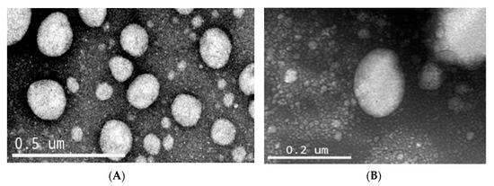 The nanoemulsions oleic acid-NE and pequi-NE were analyzed by transmission electron microscopy operating at 120 kV (Figure 1). TEM allowed us to analyze the morphology and shape of nanoemulsions. The droplets presented submicrometric diameters around 200 nm, and this result reinforced the results detailed in Table 1.