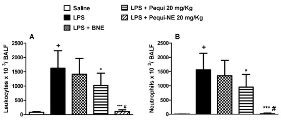 Effect of oral treatment with pequi or pequi-loaded nanoemulsion on total cells (A) and neutrophils (B) influx to mice alveolar space induced by lipopolysaccharide (LPS) instillation. Animals were orally pre-treated with 20 mg/kg of pequi oil, pequi oil-loaded nanoemulsion (pequi-NE), or blank nanoemulsion (BNE) 16 and 4 h before intranasal LPS (25 μg/25 μL) exposure. After 24 h of LPS instillation, cells were collected from bronchoalveolar lavage fluid (BALF) for cell counts. Data are expressed as the mean ± SD from 8 animals. + p < 0.05 compared to the saline group; * p < 0.05 and *** p < 0.001 compared to the LPS group; # p < 0.05 compared to the pequi group.
