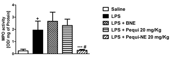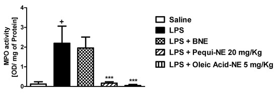 Moreover, treatment with BNE and pequi oil did not alter LPS-induced increases in MPO, a neutrophilic marker, in mouse lung tissue, while treatment with the nanoemulsion containing pequi oil dramatically attenuated the increase in MPO activity compared to the LPS group (Figure 3).