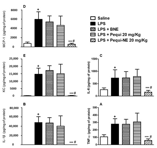Effect of oral treatment with pequi or pequi-loaded nanoemulsion on enhanced pulmonary cytokines levels induced by LPS instillation in mice. Animals were orally pre-treated with 20 mg/kg of pequi oil, pequi oil-loaded nanoemulsion (pequi-NE), or blank nanoemulsion (BNE) 16 and 4 h before intranasal LPS (25 μg/25 μL) exposure. After 24 h of LPS instillation, lungs were perfused and collected to measure levels of tumor necrosis factor alpha (TNF-α) (A), interleukin (IL)-1β (B), IL-6 (C), monocyte chemoattractant protein-1 (MCP-1) (D), and keratinocyte-derived chemokine (KC) (E), data are expressed as the mean ± SD from 5–7 animals. + p < 0.05 compared to the saline group; *** p < 0.001 compared to the LPS group; # p < 0.05 compared to the pequi group.
