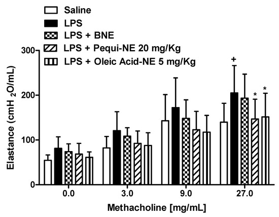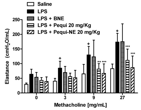As shown in Figure 5, concentrations of methacholine aerosolization (3–27 mg/mL) resulted in a significant increase in lung elastance in the LPS exposed group compared to the saline control group. Treatment with 20 mg/kg of pequi oil in free form or loaded in nanoemulsion similarly inhibited the AHR, with no significant difference between them. Animals treated with BNE showed no significant difference when compared to animals challenged with LPS.
