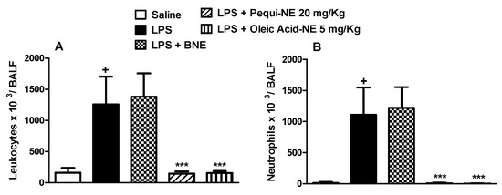 Effect of oral treatment with pequi or oleic acid-loaded nanoemulsion on total cells (A) and neutrophils (B) influx to mice alveolar space induced by LPS instillation. Animals were orally pre-treated with 20 mg/kg of pequi-loaded nanoemulsion (pequi-NE), with 5 mg/kg of oleic acid-loaded nanoemulsion (oleic acid-NE), or with blank nanoemulsion (BNE) 16 and 4 h before intranasal LPS (25 μg/25 μL) exposure. After 24 h of LPS instillation, cells were collected from bronchoalveolar lavage fluid (BALF) for cells count. Data are expressed as the mean ± SD from 7–8 animals. + p < 0.05 compared to the saline group; *** p < 0.001 compared to the LPS group.