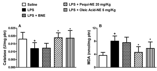 Effect of oral treatment with pequi or oleic acid-loaded nanoemulsion on mice pulmonary oxidative imbalance induced by LPS exposure. Animals were orally pre-treated with 20 mg/kg of pequi-loaded nanoemulsion (pequi-NE), with 5 mg/kg of oleic acid-loaded nanoemulsion (oleic acid-NE) or with blank nanoemulsion (BNE) 16 and 4 h before intranasal LPS (25 μg/25 μL) exposure. After 24 h of LPS instillation, lungs were perfused and collected to measure catalase activity (A) and malondialdehyde (MDA) levels (B). Catalase activity was measured by a decrease in H2O2, while the thiobarbituric acid reactive substances (TBARS) method was used to analyze MDA products as an index of oxidative damage induced by lipid peroxidation. Data are expressed as the mean ± SD from 6–8 animals. + p < 0.05 compared to the saline group; * p < 0.05 compared to the LPS group.