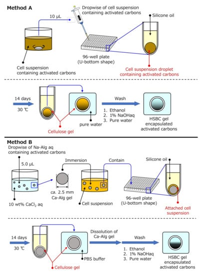 Figure 1 shows the two preparation methods of the activated carbon-encapsulated HSBC gel. Method A involved producing the BC gelatinous membrane on the interface between silicone oil and a cell suspension containing activated carbon. Method B involved producing the BC gelatinous membrane on the surface of a spherical alginate gel with a diameter of 2 to 3 mm containing activated carbon to be encapsulated in the HSBC gel. The detailed procedures are as follows: