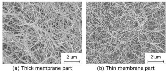 SEM observations of HSBC aerogels showed a network structure of cellulose nanofibers in both thick and thin parts of the BC membrane (Figure 3). In the thicker part of the BC gelatinous membrane, the diameter of the cellulose nanofibers was about 30 nm. On the other hand, the cellulose nanofiber of the thin part of the BC gelatinous membrane may have had a smaller diameter than that. Cellulose nanofibers were readily produced at the interface between the silicone oil and the cell suspension, and so cellulose nanofibers may have been more likely to aggregate with each other. The common feature of both was that the cellulose nanofibers formed a fine network structure with a pore size of less than 1 µm.