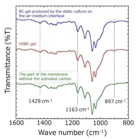 ATR-FTIR measurements of the part of membranes without activated carbon after scCO2 drying were performed (Figure 5). As a comparative sample, the BC gel obtained from the test tube and the HSBC gel were presented. These samples were dried by scCO2 with the same procedure. All samples showed nearly identical spectra and the absorptions at 1429 cm−1 (CH2 bending), 1163 cm−1 (C-O-C stretching), and 897 cm−1 (β-glucosidic linkage) that are specific to cellulose type I crystals [] were confirmed. K. xylinus biosynthesized the BC gelatinous membrane at the air–medium interface in static culture method. The ATR-FTIR spectrum of HSBC gel were consistent with the results of the static culture method, revealing that K. xylinus biosynthesized the BC gelatinous membrane at the silicone oil–medium interface. Furthermore, the ATR spectrum of the part of the membrane without activated carbon in Figure 4d agreed with the HSBC gel, indicating that these parts was formed by the BC gelatinous membrane.