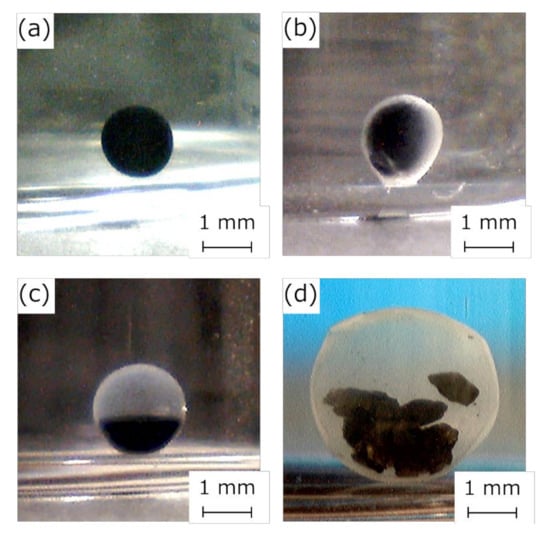 Figure 7 shows photographs of the activated carbon-encapsulated HSBC gel prepared by Method B. The activated-carbon-encapsulated HSBC gel obtained by Method B was formed with a uniform BC gelatinous membrane (Figure 7c). The encapsulated activated carbon was non-uniformly present on one side of the HSBC gel, with the same results as Method A. In the Ca–Alg gel containing activated carbon (Figure 7a), the activated carbon was uniformly dispersed. Before the Ca–Alg gel was dissolved away (Figure 7b), a thin white membrane was formed around the black Ca–Alg gel, and the inside was uniformly black, meaning that the activated carbon was uniformly distributed. Therefore, by dissolving away the Ca–Alg gel with PBS, it was considered that activated carbon precipitated in the HSBC gel and was adsorbed on the inner surface of the HSBC gel. In Method B, activated carbon with a large particle size (coconut-shell-activated charcoal, Model No. KD-GW-A, 20 × 50 mesh) was also successfully encapsulated within the HSBC gel (Figure 7d). In the encapsulation of large particles by Method A, accurate volume control was difficult because the pipette was easily clogged when the cell suspension containing activated carbon was aspirated and dropped. No leakage of these encapsulated activated carbon has been confirmed even after storage in Milli-Q water for more than a month.