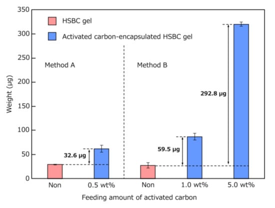 Figure 8 and Table 1 show the results regarding the amount of encapsulated activated carbon. Comparing the calculated values with the measured values, the measured values in Method A were lower than the calculated values. As explained in Figure 6, the reason for this result was that parts of the activated carbon precipitated during the cultivation period were not encapsulated. In Method B, the amount of encapsulated activated carbon was higher than the calculated value, suggesting that all the feeding-activated carbon was encapsulated. Method B successfully encapsulated more activated carbon than Method A. In the comparison of the activated-carbon-encapsulated HSBC gel by Method B, the encapsulating amount of activated carbon using Na-Alg aqueous solution containing 5 wt% activated carbon was 4.92 (≈ five times larger than that of 1 wt%). This result indicated that the amount of encapsulation depended on the feeding amount of activated carbon. In Method A, using the same amount of activated carbon as the 5 wt% of Method B, the growth of K. xylinus was inhibited, meaning that the activated-carbon-encapsulated HSBC gel could not be obtained. Therefore, Method B is more suitable for the encapsulation of large particle sizes or a large amount of activated carbon within the HSBC gel.