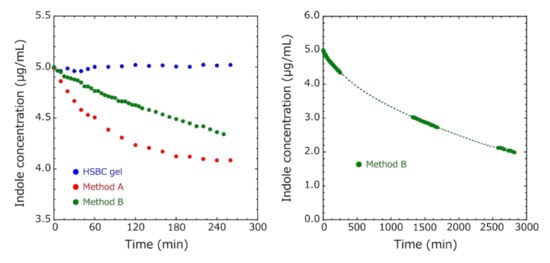 An adsorption test of indole, which is a precursor of the uremic toxin, on the activated carbon encapsulated in HSBC gel was performed at 37 °C. The initial concentration of indole was 5.0 µg/mL []. In the adsorption test, three pieces of the activated- carbon-encapsulated HSBC gel (total activated carbon: 32.6 × 3 = 97.8 µg) obtained by Method A were added to a 3 mL indole aqueous solution. On the other hand, an adsorption test was carried out with one activated-carbon-encapsulated HSBC gel (activated carbon: 292.8 µg) obtained by Method B.