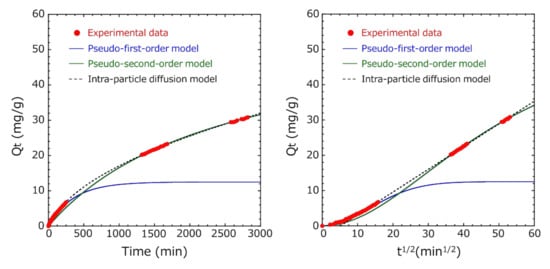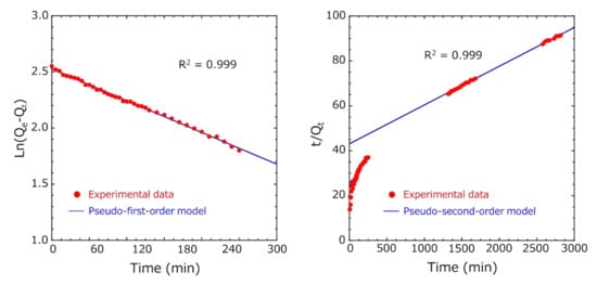 Similarly, in Method B, in the pseudo-first-order absorption kinetics, the Ln(Qe − Qt) vs. time plot was fitted so that the R2 value was the highest in the entire measurement range until 2820 min, but the initial fitting accuracy of adsorption was low (Figure 11). Ho et al. reported that the pseudo-first-order model fits well in the initial stages of adsorption, as the adsorption amount increases sharply []. Many researchers have analyzed various adsorbent and adsorbate combinations using the pseudo-second-order model [,]. Therefore, fitting was performed using the pseudo-first-order model in the initial stage of adsorption and the pseudo-second-order model in the later stage of adsorption (Figure 12). By dividing the total into two regions, we succeeded in fitting (R2 = 0.999) both the initial and later stages of adsorption very well. The adsorption capacity at equilibrium Qe1 of the pseudo-first-order model was 12.8 mg/g, and the adsorption capacity at equilibrium Qe2 of the pseudo-second-order model was 57.9 mg/g.