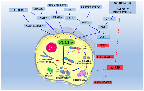 Schematic representation of the pathways regulating mitochondrial biogenesis, dynamics, and mitophagy. External factors (exercise, caloric restriction, or drugs such as bezafibrate, 5-aminoimidazole-4-carboxamide ribonucleoside (AICAR), resveratrol, or nicotinamide riboside (NR) upregulate the expression of PGC-1α, which in turn activates essential mitochondrial genes. Other drugs can act on NO pathway (PDE5 inhibitors as Sildenafil) or mitochondrial autophagy (Rapamycin). Blue arrows and squares indicate positive regulations, while red arrows and squares indicate negative regulations.