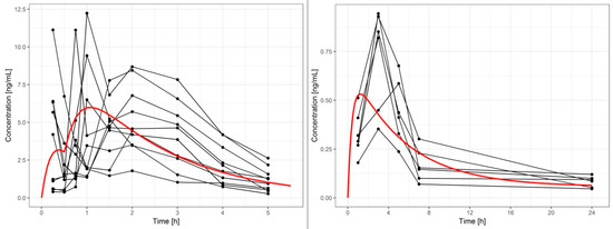 Absorption after oral administration was variable, with double peaks in the majority of the individual profiles (Figure S2). Moreover, in some subjects, the first peak was predominant over the second, while in others, it was the opposite. This double peak phenomenon was modelled as absorption from two compartments with the lag-time and variable ratio of the amount of the drug absorbed by the two pathways.
