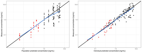 Goodness of fit plots of the final pharmacokinetic model of tetraene. Circles—measured versus population predicted concentration (left) and measured versus individual predicted concentration (right) after transdermal (red) and oral (black) administration. Black line—identity line; blue line—loess fit.