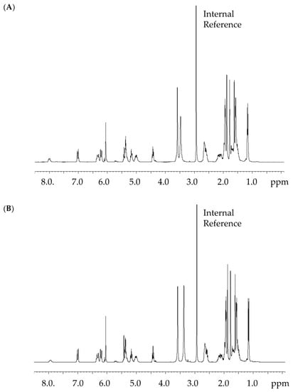 1H NMR spectra (300 MHz) of CorA batch A (A) and B (B) in acetonitrile-d3/D2O (6:1) with the internal reference compound dimethyl sulfone.