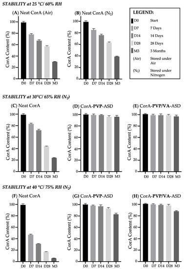 Stability analysis of neat CorA (A–C,F), CorA-PVP-ASD (D,G), and CorA-PVP/VA-ASD (E,H) formulations by HPLC-DAD. Samples were stored in closed twist-off glass vials with desiccant at 25 °C/60% RH (A,B), 30 °C/ 65% RH (C–E) and 40 °C/75 % RH (F–H) (n = 3, mean, SD).