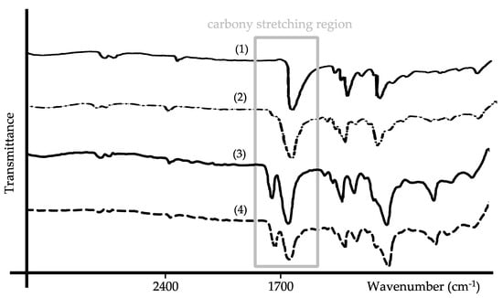 Fourier-transform-infrared (FT-IR) spectra of PVP (1), the CorA-PVP-ASD formulation (2), PVP/VA (3), and the CorA-PVP/VA-ASD formulation (4).