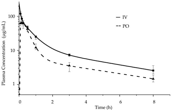 The maximum concentration (Cmax) after the IV administration was 119.6 (103.7–136.7) µg/mL (median, IQR) at the first time point at 5 min, the concentrations measured at the following time points decreased in value as expected after IV administration as a function of drug elimination. The measured Cmax after PO administration was 64.3 (61.8–70.7) µg/mL (median, IQR) at the second time point at 10 min. Based on the Akaike information criterion and Schwarz criterion (both implemented in the pharmacokinetic software GastroPlus® Version 9.7 and PKPlus™ Version 2.5) the two-compartment model was found to be optimal to describe the plasma concentration time profiles after IV and PO administration of CorA [,,]. For that, each compartment displayed a first order elimination kinetic (two apparent slopes in the semi logarithmic scale (Figure 8)).