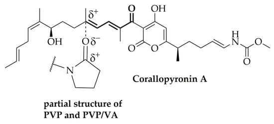 Chemical structures of the natural antibiotic corallopyronin A (CorA) (A), and the polymers povidone (PVP) (B) and copovidone (PVP/VA) (C).