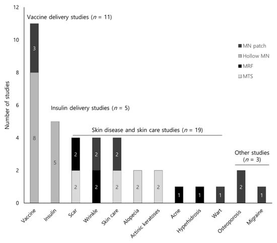 Scars, wrinkles, skin condition (n = 4 respectively, 21.1%); alopecia, actinic keratosis (AK, n = 2 respectively, 10.5%); and hyperhidrosis, acne, and warts (n = 1 respectively, 5.3%) were included in skin diseases and skin care studies. MTS (n = 8), MRF (n = 6), and MAP (n = 5) were used for drug delivery.