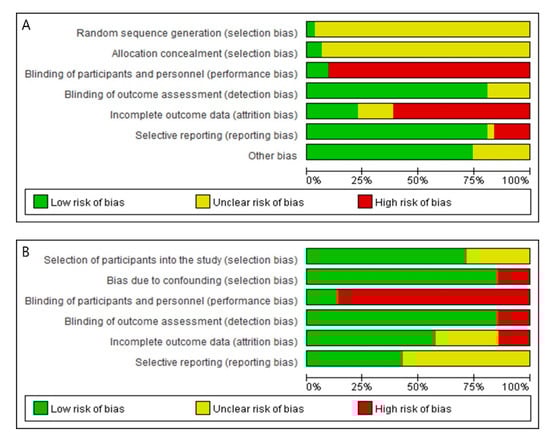 Risk of bias graph: (A) Risk of bias graph of randomized controlled trials (RCTs); (B) Risk of bias graph of controlled clinical trials (CCTs).3.3.2. Risk of Bias in Clinical Controlled Trials (Non Randomized Studies) (n = 7).