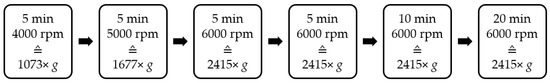 A centrifugation test was performed to determine the water holding capacity of the preparations. For this purpose, 1.25 g of each formulation (i), (ii), (iii), (iv), and (v) was weighed into a centrifugation tube and centrifuged in an Eppendorf MiniSpin Centrifuge (Eppendorf AG, Hamburg, Germany) according to the scheme indicated (Figure 3). After each centrifugation step, the formulations were visually examined with respect to water separation. If no phase separation occurred, the test was continued at the next stage.