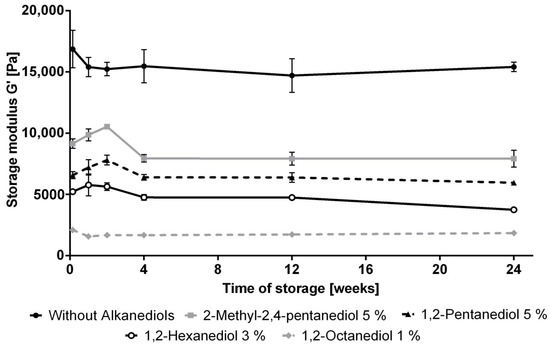 Figure 5. Influence of alkanediols on the storage modulus G’, n = 3, mean ± standard deviation.