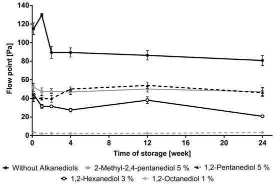 The flow points of the different creams during storage are displayed in Figure 6. The NHC without the addition of alkanediols demonstrated the highest flow point. The formulations containing 1,2-pentanediol and 2-methyl-2,4-pentanediol showed similar flow points, whereas its value for the cream with 1,2-hexandiol was clearly reduced. 1,2-Octanediol has the highest impact on the flow point of the tested creams. It is worth to mention, that although the addition of 1,2-octanediol yielded very low flow points, the samples did not freely flow under the influence of gravity from the storage container.