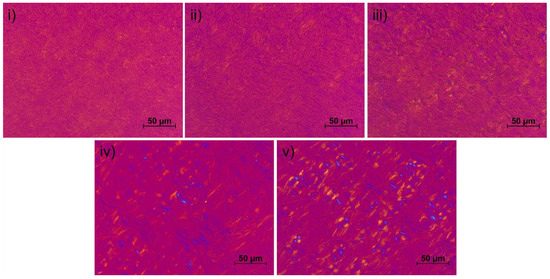 Figure 7. Polarization microscopic images of the formulations stored over 6 months: (i) pure NHC, (ii) 2-methyl-2,4-pentanediol 5%, (iii) 1,2-pentanediol 5%, (iv) 1,2-hexanediol 5%, (v) 1,2-octanediol 1%.