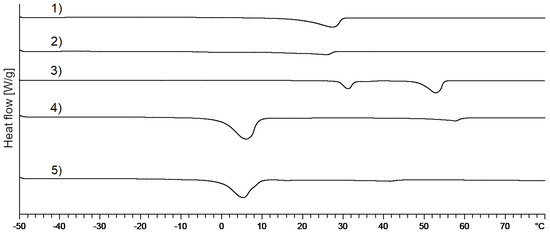 Figure 10. DSC thermograms of (1) 1,2-octanediol; (2) polysorbate 60; (3) cetostearyl alcohol; (4) mixed crystal: 1,2-octanediol, standard concentration; (5) mixed crystal: 1,2-octanediol, 10-fold concentration.