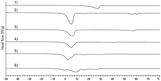 Figure 11. DSC thermograms of (1) 1,2-octanediol; (2) mixed crystal without alkanediols; (3) mixed crystal: 1,2-octanediol, standard concentration; (4) mixed crystal: 1,2-octanediol, 10-fold concentration; (5) mixed crystal: 1,2-octanediol, 20-fold concentration; (6) mixed crystal: 1,2-octandiol, 30-fold concentration.