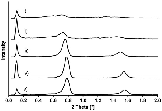 Figure 12. SAXS diffraction patterns of mixed crystals of (i) cetostearyl alcohol, polysorbate 60 and water in the presence of (ii) 2-methyl-2,4-pentanediol, (iii) 1,2-pentanediol, (iv) 1,2-hexanediol, (v) 1,2-octanediol.