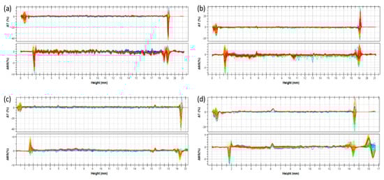 Stability profiles of LCNs by using Turbiscan Lab® Expert. The various panels show the profiles of delta transmission (∆T) and delta back scattering (∆BS) as a function of time (0–3 h) and sample height (mm) at 24 ± 1 °C of the various investigated LCN formulations: (a) empty LCNs, (b) minoxidil-loaded LCNs at 0.5% w/v (as active compound), (c) fluorescein-loaded LCNs at 0.1% w/v and (d) red oil-loaded LCNs at 0.1% w/v.