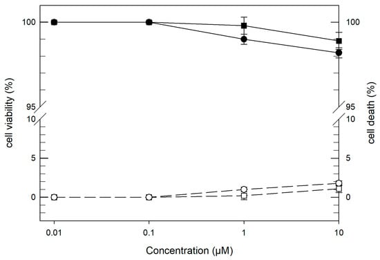 Cytotoxic effect of empty LCNs on human keratinocytes (NCTC2544) cells as a function of increasing lipid concentration after 72 h of incubation. LCNs cytotoxic effect is expressed both as percentage of cell viability (filled symbols and solid line, •) by MTT test and percentage of cell death (hollow symbols and dashed line, ◦) by trypan blue dye exclusion assay. For each experiment, untreated cells (■, □) were considered as control. Results represents the average of six different experiments ± standard deviation. If error bars are not visible, they are within the symbols.