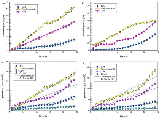 The release (panels a and b) and percutaneous permeation (panels c and d) profiles of the investigated nanocarrier over 24 h are reported in Figure 3. The release data of both probes from the investigated nanocarriers showed the following decreasing release rate: transfersomes® > LCNs > SLNs. Similar to the entrapment efficacy findings, the probe release rate was dependent on the nanocarriers rather than on the physiochemical features of the entrapped compounds. Interestingly, in the case of the hydrophobic red oil O (Figure 3b), the overall amount released over 24 h from LCNs was very close that released from transfersomes®.