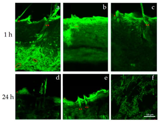 Micrographs of skin sections after 1 h and 24 h from the treatment with the various fluorescein-loaded nanocarriers. Keys: (a) transfersomes®, (b) SLNs, (f) SLNs, superficial view (c) LCNs, (d) up and (e) down of the skin section treated with transfersomes®. Some skin elements are highlighted with the following symbols: * stratum corneum (SC), ** pilosebaceous follicle, circle: blood vessels.