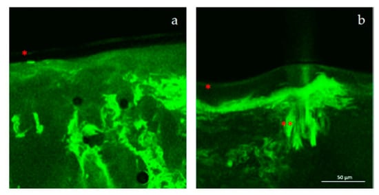 Fluxes of the two probes were also investigated to evaluate the quantitative percutaneous permeation through membrane sheets. In the case of red oil O the fluxes were 5.68 × 10−3 ± 3.03 × 10−4 μg/cm2 h−1, 3.05 × 10−2 ± 2.03 × 10−3 μg/cm2 h−1, 9.04 × 10−2 ± 6.11 × 10−3 μg/cm2 h−1, 1.32 × 10−1 ± 8.19 × 10−3 μg/cm2 h−1 for the probe solution, SLNs, LCNs, and Transfersomes®, respectively. Also, in the case of fluorescein, the analysis of the fluxes confirmed a greater percutaneous permeation in the case of the encapsulation of the hydrophilic probe in Transfersomes®. In particular, fluxes were 1.61 × 10−2 ± 2.94 × 10−4 μg/cm2 h−1, 4.97 × 10−2 ± 3.51 × 10−3 μg/cm2 h−1, 1.09 × 10−1 ± 7.58 × 10−3 μg/cm2 h−1, 1.71 × 10−1 ± 3.66 × 10−3 μg/cm2 h−1 for the probe solution, SLNs, LCNs, and Transfersomes®, respectively.