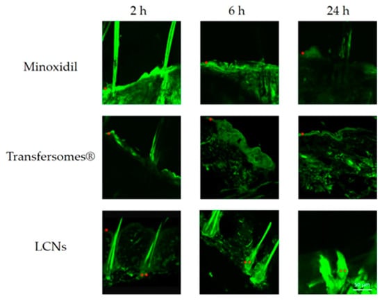 Minoxidil, an active compound that is able to modulate the hair loss and regrowth, was encapsulated (0.5% w/v) in transfersomes® and LCNs to compare their capability to reach the deeper skin layers and deliver actives into the pilosebaceous unit. The skin distribution of minoxidil can be easily detected owing to its fluorescence property. Micrographs of the skin of untreated rats (Figure S2) showed the very low autofluorescent phenomena occurring when the nanosystems have not been administered. As can be seen in Figure 6, the hydro-alcoholic formulation of minoxidil was not able to selectively reach its target, in fact it was widely distributed in the different skin layers and it was rapidly metabolized, in fact a very low fluorescence has been detected after 6 h from the treatment. In contrast, minoxidil-loaded LCNs had a greater targeting capacity to the pilosebaceous unit as well as a longer in situ lifetime (until 24 h). Meanwhile, minoxidil-loaded transfersomes® were characterized by a random distribution in the skin and an increase of a non-selective percutaneous permeation.